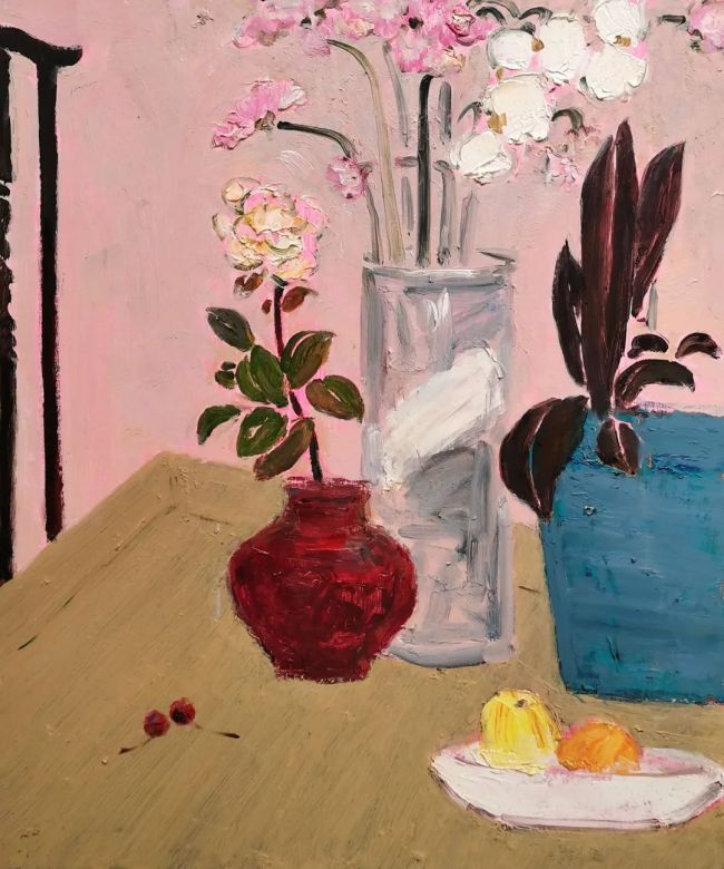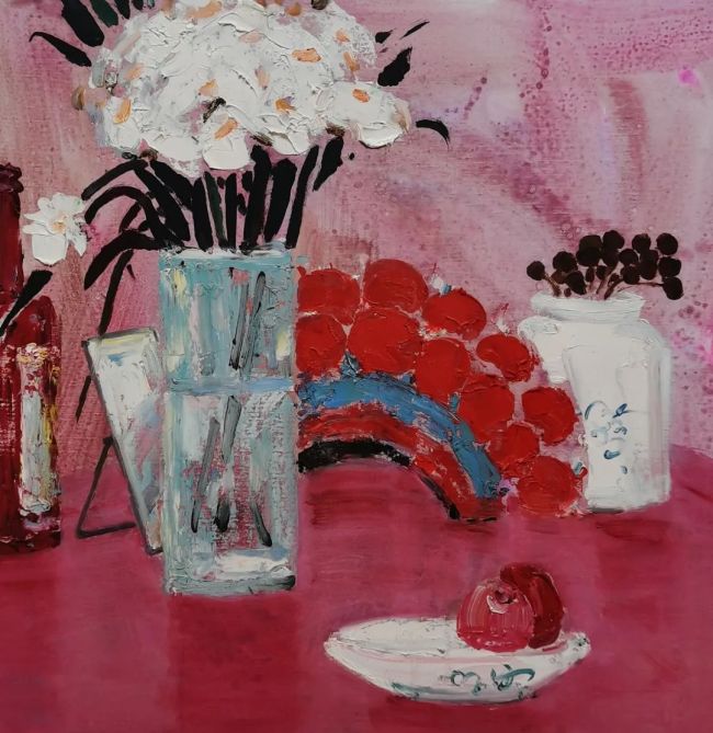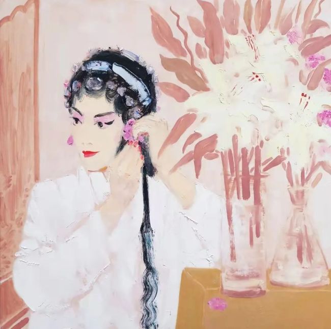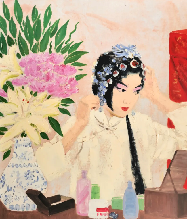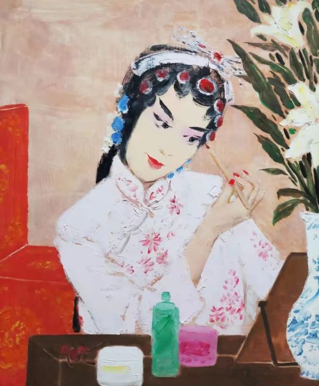 在用色上,他借用了我国传统风俗的颜色,将绘画,戏剧,音乐奇妙的交融。镜子中戏剧人物的姿势与动作所传递出的韵律之美,正是音乐节奏与戏剧板眼恰如其分的表达。人物眼睛“拎神”,回视反转;身段优美,翩若飞鸿;踏步有“轧劲”,微步小巧。他的画面走笔浓淡,克制铿锵。人物站如亭亭玉树,行如春送清风。纵有雄姿英才,亦是水袖飞泓。